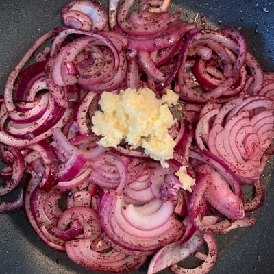 stap 1: snijd de ui door midden en vervolgens in halve dunne plakken. Verwarm een koekenpan en bak de ui op een middel tot laag vuurtje glazig. (10/15 min)