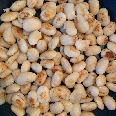 stap 4: Laat de witte bonen uitlekken. Doe 2/3 van de boter in de pan (gebruik dezelfde koekenpan) en voeg hier de witte bonen aan toe. Bak de bonen bruin. Het is normaal als de bonen tijdens het bakken wat gaan knetteren. Dit komt omdat de vocht in de bonen weg wil. Als de bonen een kleurtje hebben (zie afbeelding) voeg je een snufje zout toe aan de bonen en zet je het geheel weg.